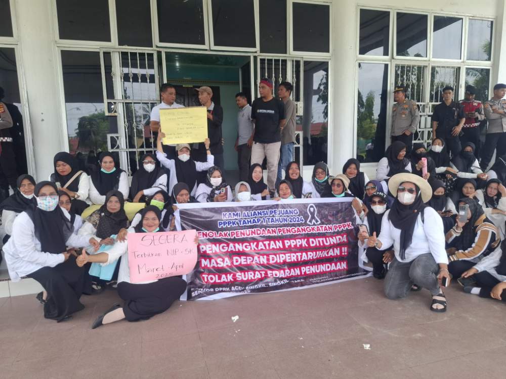 Ratusan honorer yang hadir mengenakan seragam kemeja putih dan celana hitam, memenuhi halaman kantor DPRK Aceh Singkil.