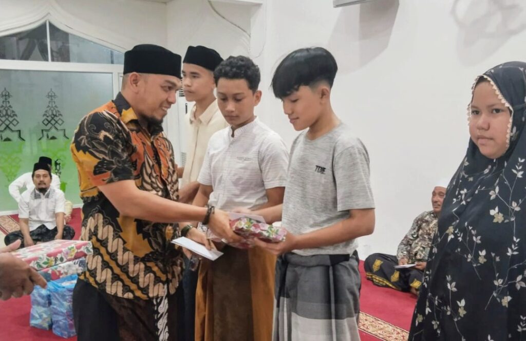 Keterangan Foto: Geuchik Gampong Lhok Banie Yusri, SH saat memberikan santunan pada Anak yatim usai shalat tarawih berjamaah, Kamis (20/03/2025).