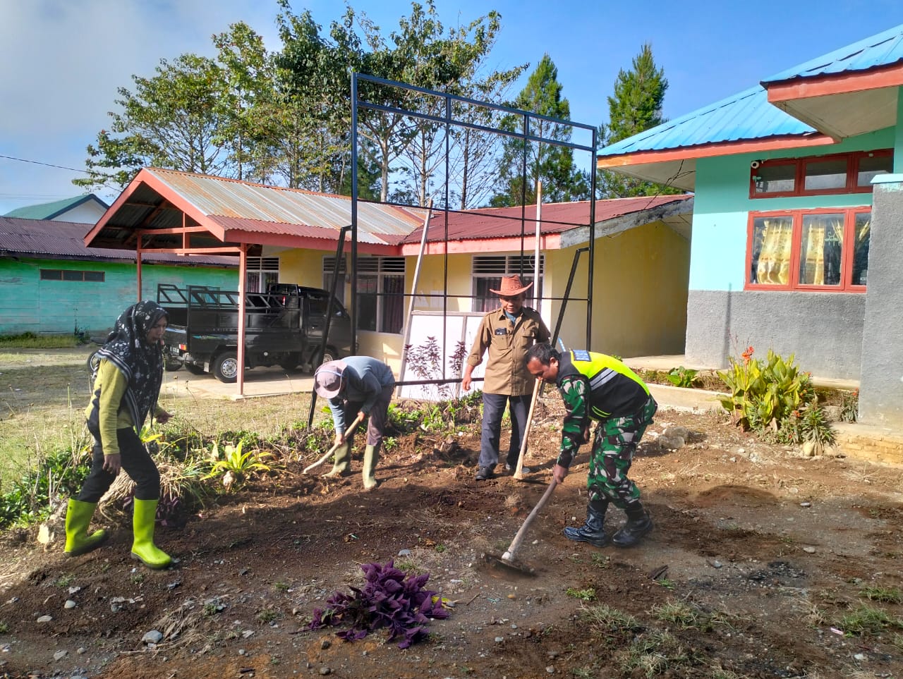 Sertu Moh. Muhni bersama aparat desa dan warga tersebut dengan semangat sambil bercanda ria membersihkan halaman kantor Desa.