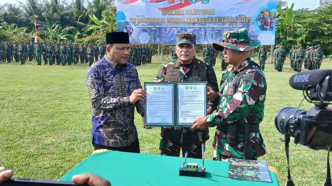 Penyerahan naskah hasil kegiatan TMMD baik pembangunan fisik dan non fisik dilokasi sasaran Gampong Hagu, Kecamatan Peudada, dalam upacara penutupan TMMD, Kamis (20/3/2025) pagi dilapangan bola kaki Gampong Meunasah Pulo.