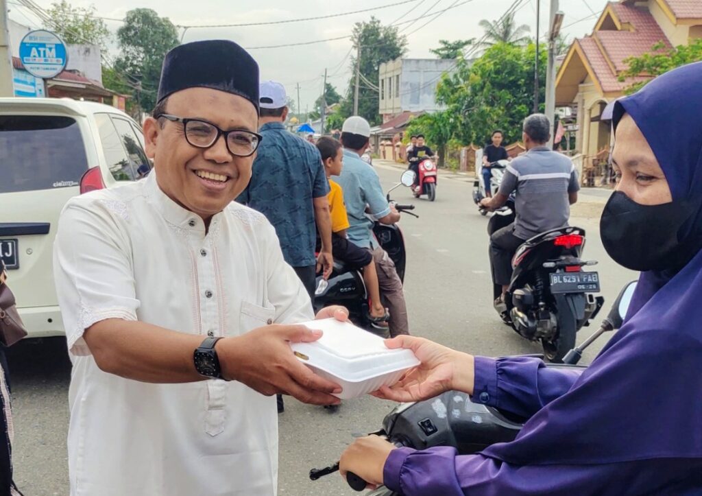 Pembagian 100 paket takjil yang dibagikan yaitu ayam penyet pada pengendara yang melintas di depan Kampus STIM Pase, Jalan Kebun Baru, Gampong Paya Bujok Seulemak, Kecamatan Langsa Baro, Minggu (24/03/2025).