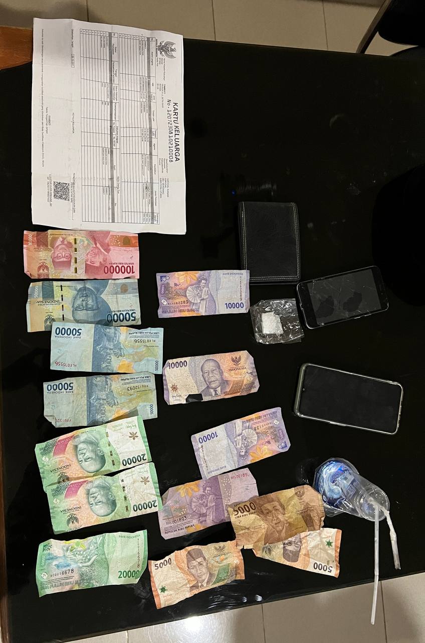 Barang bukti yang ditemukan, antara lain : 1 paket Sabu-sabu/kristal sekitar 1 gram dengan perkiraan senilai Rp. 1.500.000,- (satu juta lima ratus ribu rupiah), Uang tunai sebanyak Rp. 365.000,- (Tiga ratus enam puluh lima ribu rupiah), 1 buah dompet hitam, 1 buah bong/alat hisap sabu, 1 buah kopiah hitam, 1 buah Handphone (HP) jenis Realme type C35 warna hijau dan 1 unit sepeda motor jenis Honda Supra warna hitam.