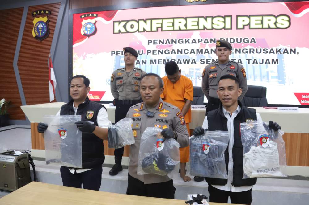 A1news.co.id|Pekanbaru – Polda Riau melaksanakan Konferensi Pers bertempat di Media Center Polda Riau terkait pengungkapan kasus pengancaman yang viral di Media Sosial, yang dihadiri oleh Kabid Humas Polda Riau Kombes Pol Anom Karibianto, SIK, Direktur Reskrimum Polda Riau Kombes Pol Asep Darmawan SH SIK, serta Kasubdit III Jatanras Ditreskrimum AKBP Rooy Noor, S.I.K., M.H. Senin (14/4/2025)