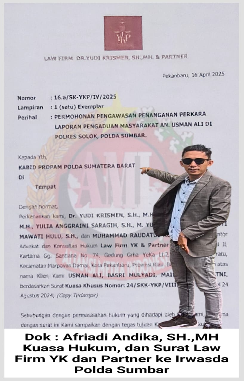 “Permohonan Pengawasan Penanganan kepada Irwasda dan Kabid Propam Polda Sumbar bernomor :16.b/SK-YKP/IV/2025 tertanggal 16 April 2025, diberikan atas Perkara nama Klien Kami berdasarkan Nomor Surat Kuasa Khusus bernomor :24/SKK-YKP/VIII/2024 tertanggal 24 Agustus 2024.” ucap Afriadi Andika,SH.,MH dalam pres rilisnya.