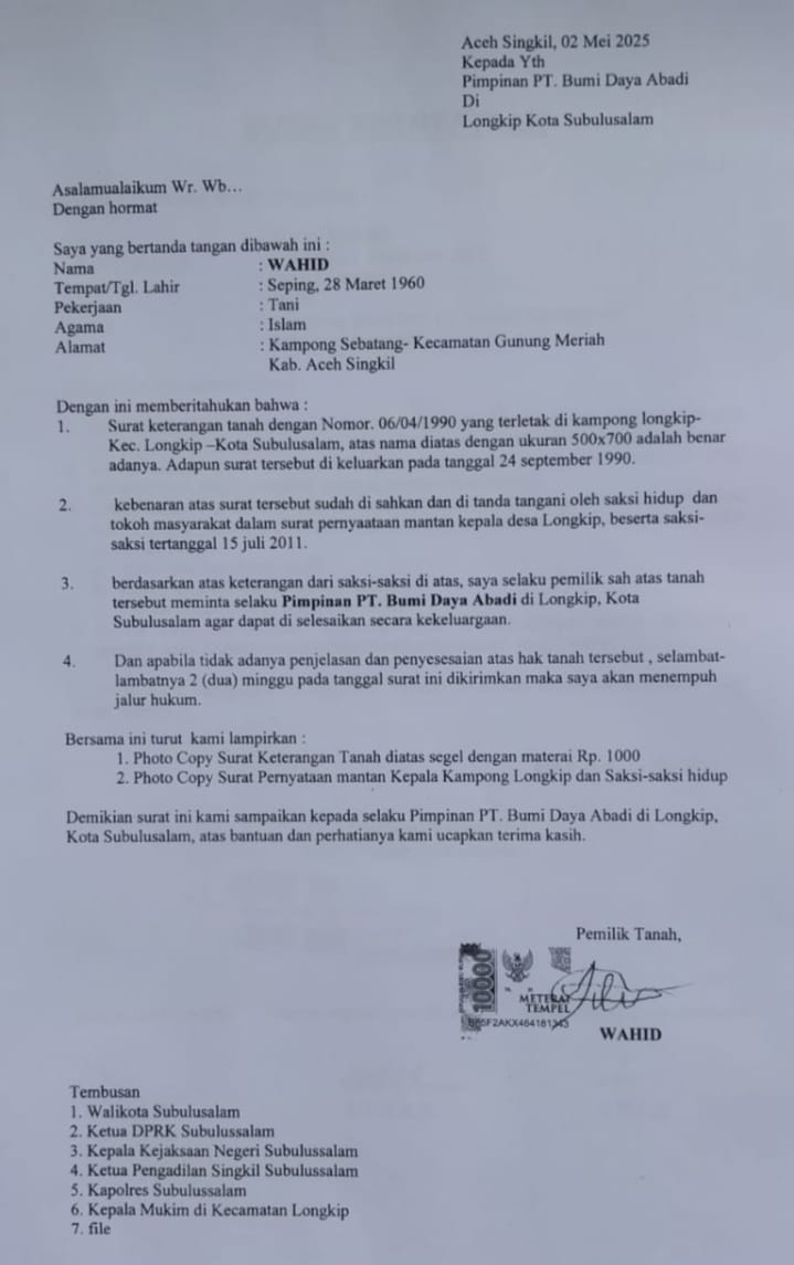 A1news.co.id|Subulussalam – Sebuah surat telah dilayangkan oleh An. Wahid kepada PT BDA Longkib terkait kepemilikan lahan seluas 500 x 700 meter yang masuk dalam lokasi perkebunan PT BDA di wilayah Kecamatan longkib.