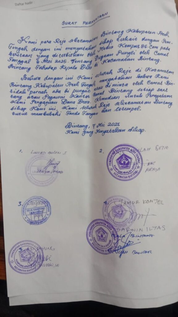 “Kami Reje Kampung se Kecamatan Bintang Kabupaten Aceh Tengah menyatakan sikap terkait dengan sebuah pemberitaan yang di terbitkan oleh media Online Kompas86.com pada tanggal 06 mei 2025 tentang Pungli yang di lakukan oleh Camat terhadap Kepala Desa se Kecamatan Bintang”.