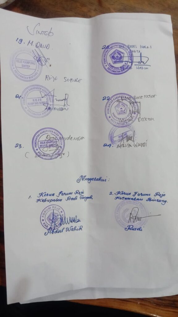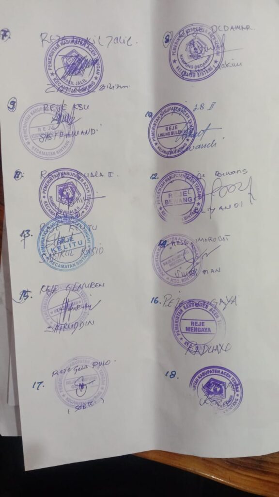 Surat pernyataan tersebut tanggal 07 Mei 2025 langsung di tanda tangani oleh 24 Reje Kampung, mengetahui Ketua Forum Reje Kampung Kecamatan Bintang Rusdi dan Ketua Forum Reje Kabupaten Aceh Tengah Abdul Wahid.