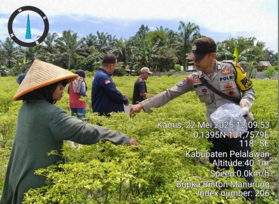 A1news.co.id | RIAU || Polsek Langgam melalui Bhabinkamtibmas Desa Langkan Bripka Binton Manurung turut serta dalam kegiatan panen cabe rawit yang digelar oleh Kelompok Tani Tri Harjo di Dusun Sidomulyo, Desa Langkan, Kecamatan Langgam, Kabupaten Pelalawan, pada Kamis (22/5). Kegiatan ini bukan hanya bertujuan meningkatkan ketahanan pangan, tetapi juga memperkuat ekonomi masyarakat setempat.
