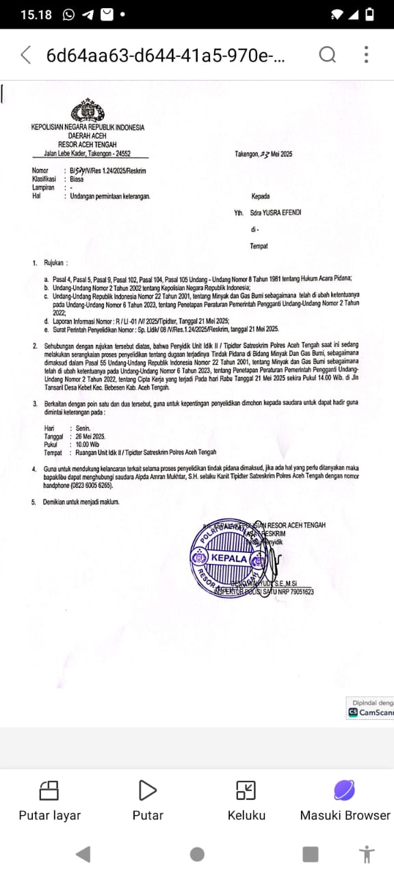 A1news.co.id|Takengon – Kepolisian Resor (Polres) Aceh Tengah melalui Satuan Reserse Kriminal (Satreskrim) resmi melayangkan surat undangan kepada Yusra Efendi untuk hadir dan memberikan keterangan dalam penyelidikan dugaan tindak pidana di bidang minyak dan gas bumi (migas), Sabtu, 23 Mei 2025.