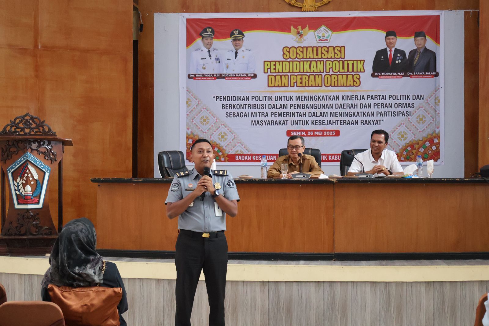 Acara kegiatan Sosialisasi Pendidikan Politik dan Peran Organisasi Kemasyarakatan yang di buka resmi oleh Asisten Administrasi Umum Sekretariat Daerah Kabupaten Aceh Tengah, Sukirman, S.STP. M.Ec.Dev mewakili Bupati Aceh Tengah.
