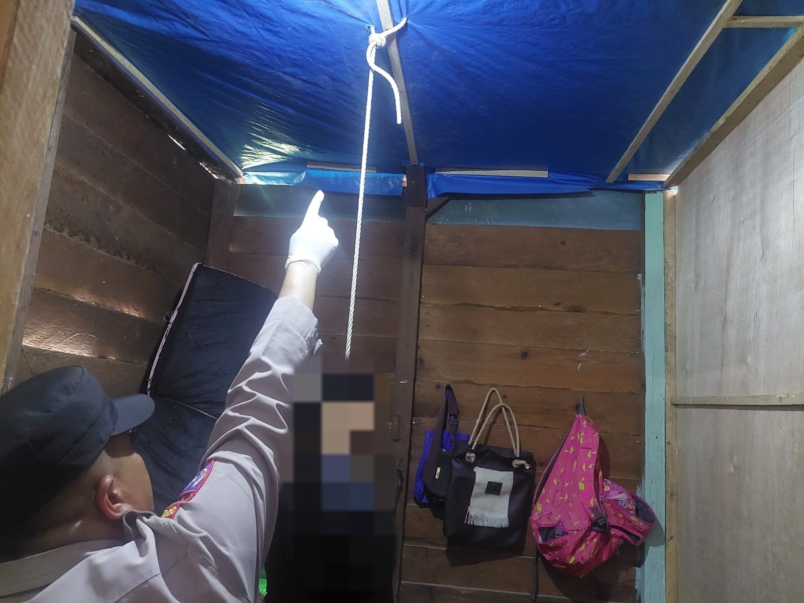 Sesampainya di lokasi, petugas menemukan korban tergantung menggunakan seutas tali jemuran yang diikat pada kayu langit-langit rumah.