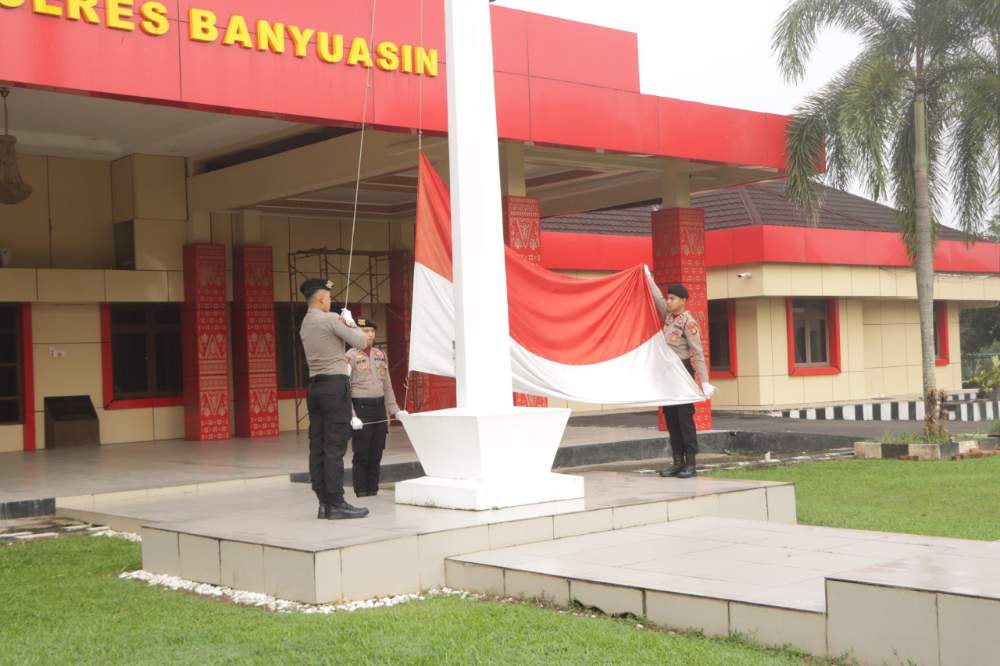A1news.co.id|Banyuasin – Kepolisian Resor (Polres) Banyuasin menggelar upacara kenaikan Bendera Merah Putih pada peringatan Hari Lahir Pancasila ke-80 di halaman Mapolres Banyuasin, Senin 2 Juni 2025.