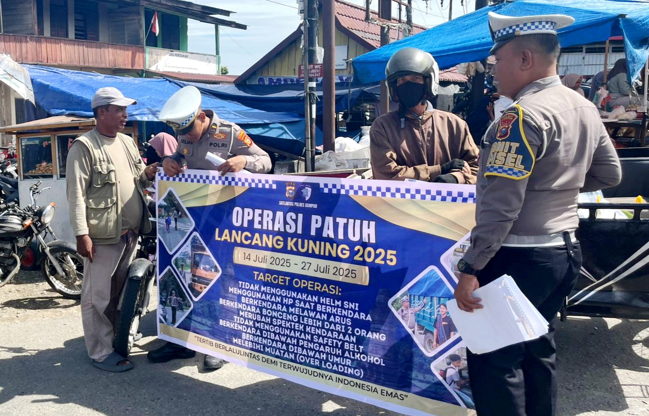 KAMPAR, a1news.co.id– Satuan Lalu Lintas (Satlantas) Polres Kampar gencar mensosialisasikan Operasi Patuh Lancang Kuning 2025 kepada masyarakat. Selasa (15/7/2025), pukul 10.30 WIB, tim dari Satlantas Polres Kampar yang terdiri dari Kanit Turjawali Ipda Brilian Sendi Putra Darpita, S.Tr.K, Kanit Kamsel Aiptu Junaydi, S.E., dan Bripda M. Resky Rivanda, melakukan sosialisasi melalui pemasangan spanduk di berbagai titik strategis di wilayah hukum Polres Kampar.