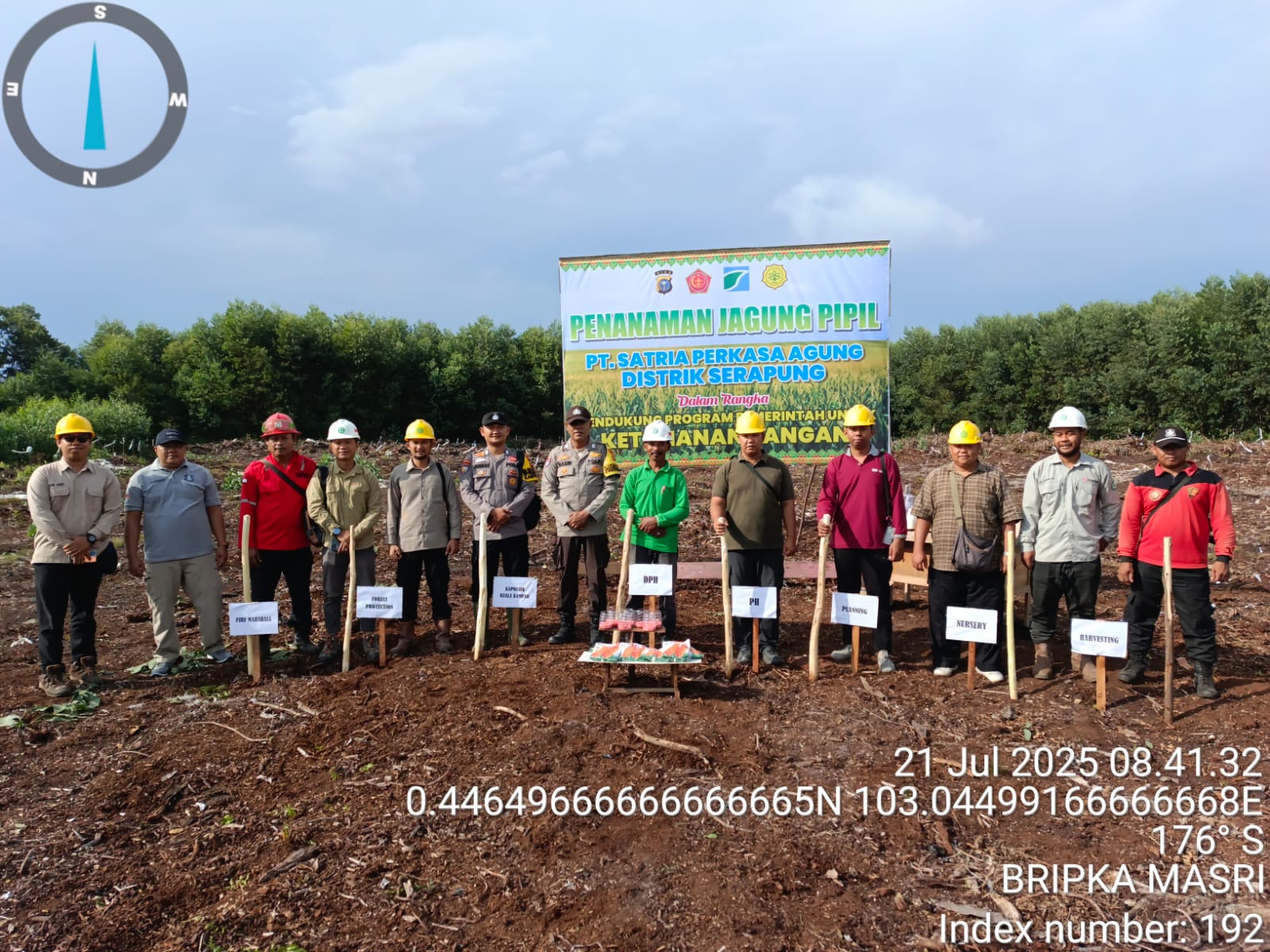 Kegiatan penanaman jagung ini berlangsung pada Senin (21/7/2025) sekitar pukul 08.00 WIB di lahan ketahanan pangan PT Satria Perkasa Agung (SPA), Desa Serapung, Kecamatan Kuala Kampar.