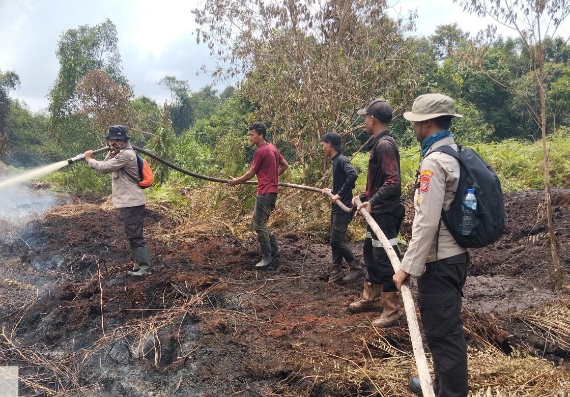 A1news.co.id | RIAU || Polres Pelalawan bersama unsur TNI, BPBD, Damkar, RPK perusahaan, dan masyarakat melanjutkan kegiatan pendinginan dan mitigasi kebakaran hutan dan lahan (Karhutla) hari keempat di Kecamatan Teluk Meranti, Kabupaten Pelalawan.