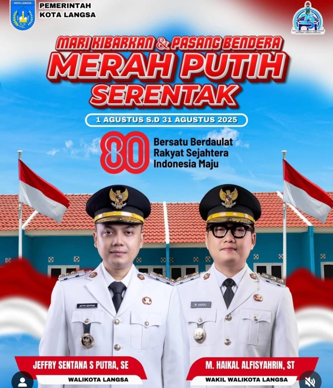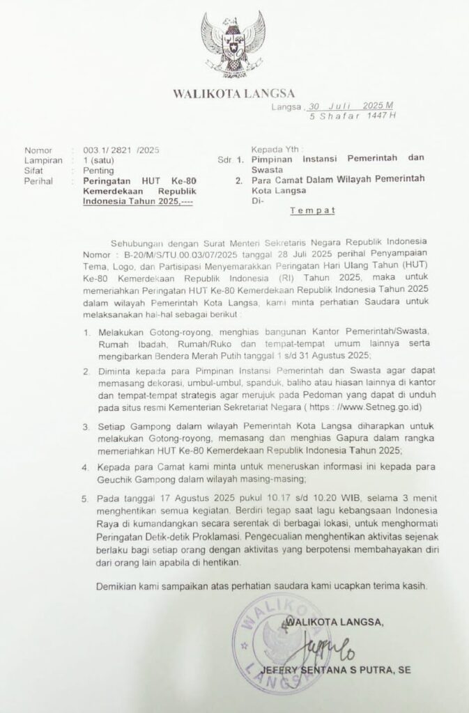 Wali Kota Langsa Jeffry Sentana S Putra, SE, mengatakan, himbauan ini sesuai dengan instruksi yang tertuang dalam surat Menteri Sekretaris Negara Republik lndonesia Nomor : B-20/M/STU.00.03/07/2025 tanggal 28 Juli 2025 perihal Penyampaian Tema, Logo, dan Partisipasi Menyemarakkan Peringatan Hari Ulang Tahun (HUT) Ke-80 Kemerdekaan Republik Indonesia Tahun 2025.