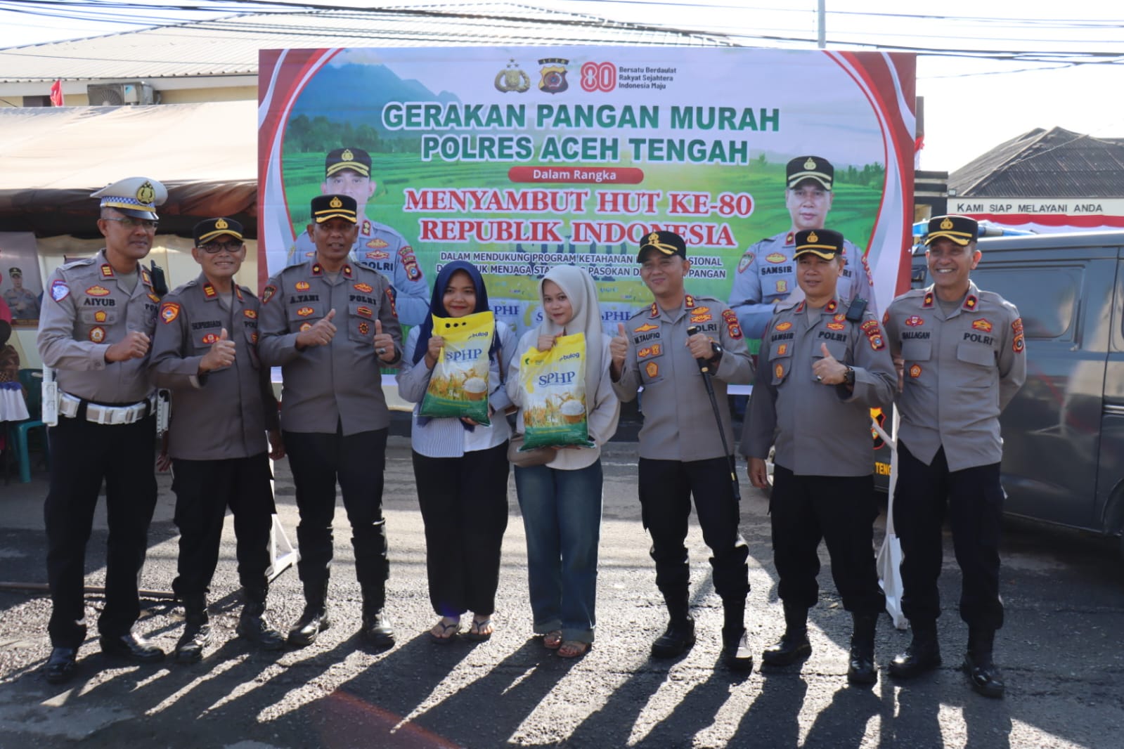 A1news.co.id|Takengon – Menyambut Hari Ulang Tahun (HUT) ke-80 Kemerdekaan Republik Indonesia sekaligus mendukung program ketahanan pangan nasional, Polres Aceh Tengah menggelar Gerakan Pangan Murah (GPM) di halaman Mako Polres Aceh Tengah, Jumat (8/8/2025) pagi.