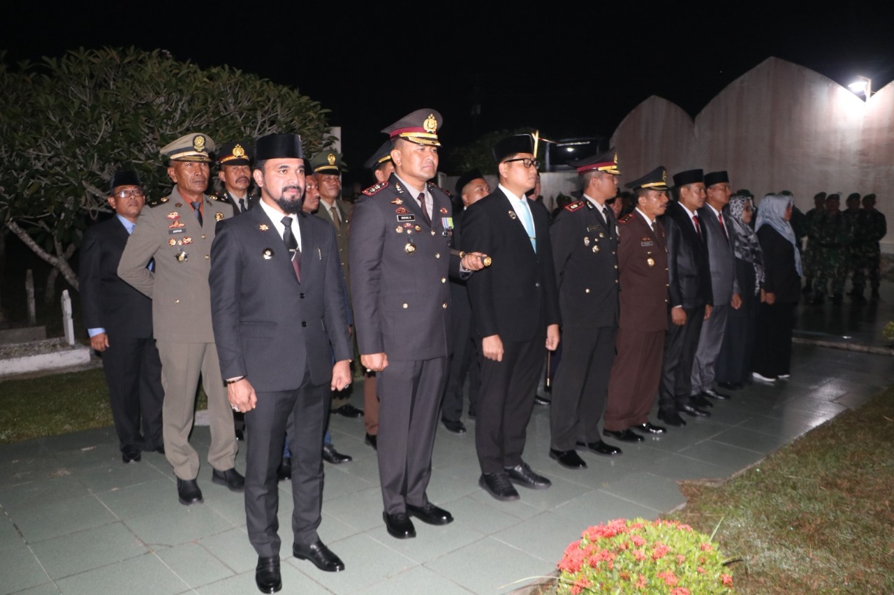 Aceh Timur – Kepala Kepolisian Resor Aceh Timur, Polda Aceh AKBP Irwan Kurniadi, S.I.K. bersama unsur Forkopimda Kabupaten Aceh Timur dan Forkopimda Kota Langsa mengikuti apel Kehormatan dilanjutkan Renungan Suci dalam rangka memperingati HUT Kemerdekaan RI Ke- 80 di taman makam pahlawan (TMP) Kota Langsa, Sabtu, (16/08/2025) malam.