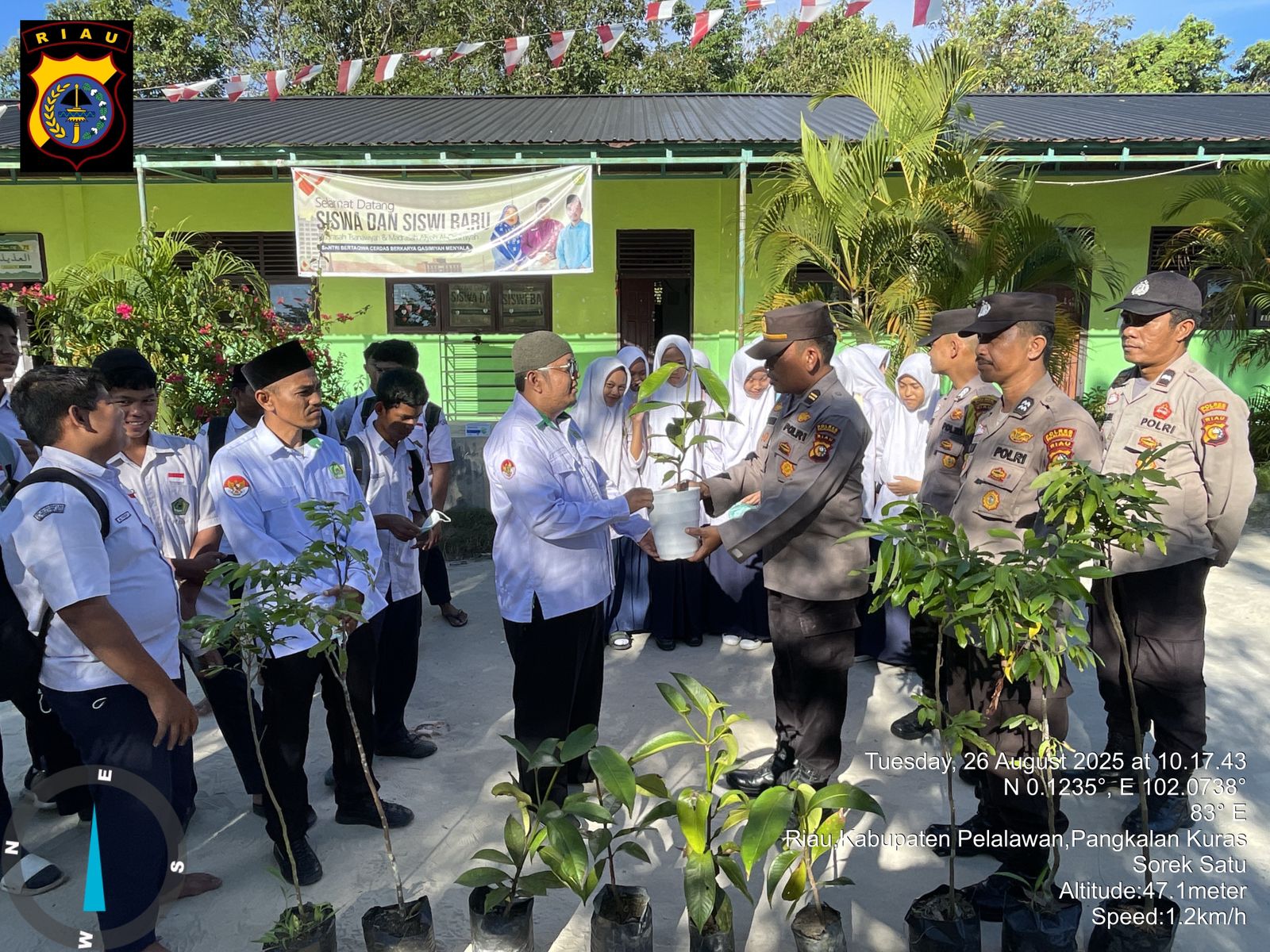 A1news.co.id | RIAU || Dalam rangka mendukung program Green Policing yang digagas Kepolisian Daerah (Polda) Riau, jajaran Polsek Pangkalan Kuras, Polres Pelalawan, melaksanakan kegiatan penanaman bibit pohon dan pembagian masker kepada para pelajar di MTS Al-Qasimiyah, Kelurahan Sorek Satu, Selasa pagi, 26 Agustus 2025.