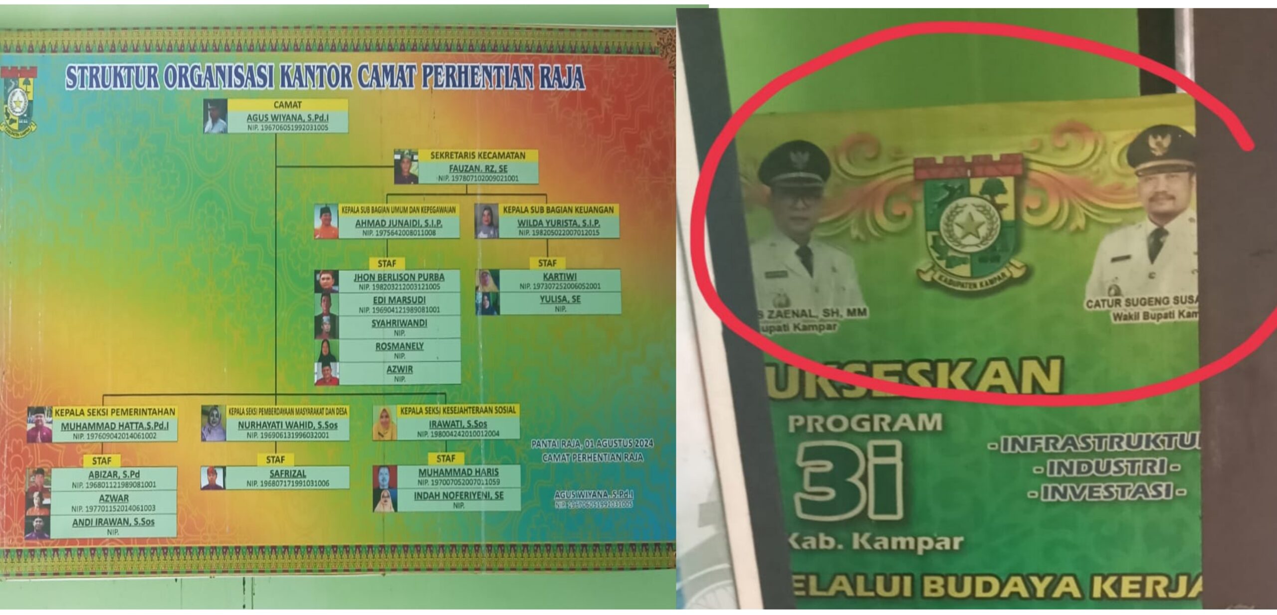 Di mana di pojok pojok dinding ruang tamu kantor camat masih menggunakan spanduk pejabat pejabat yang lama yaitu salah satu spanduk Bupati Kampar yang lama Aziz (Alm) dan Wakil Bupati Catur Sugeng.