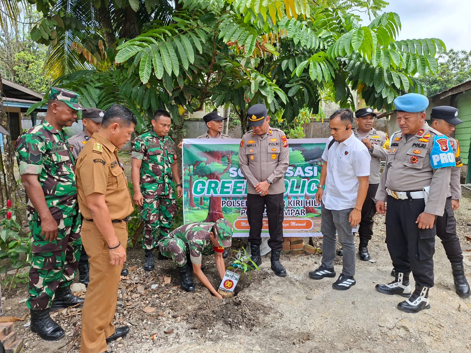 Juga menyerahkan hadiah ulang tahun TNI ke 80 berupa bibit pohon mangga oleh Kapolsek Kampar Kiri Hilir kepada Danpos Koramil Kampar Kiri Hilir.