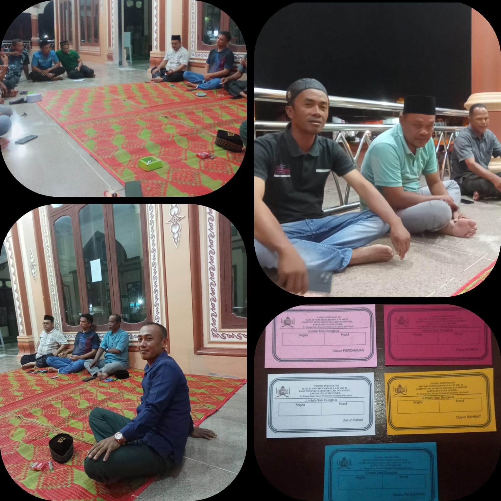 Rapat dihadiri oleh berbagai unsur masyarakat, termasuk lima kepala dusun (Kadus), Ketua Panitia Azwir, S.H., Ketua BKM Baitussalihin, Sekretaris Desa, Khatib, Imam Masjid, perwakilan BPKAM, serta tokoh pemuda setempat.
