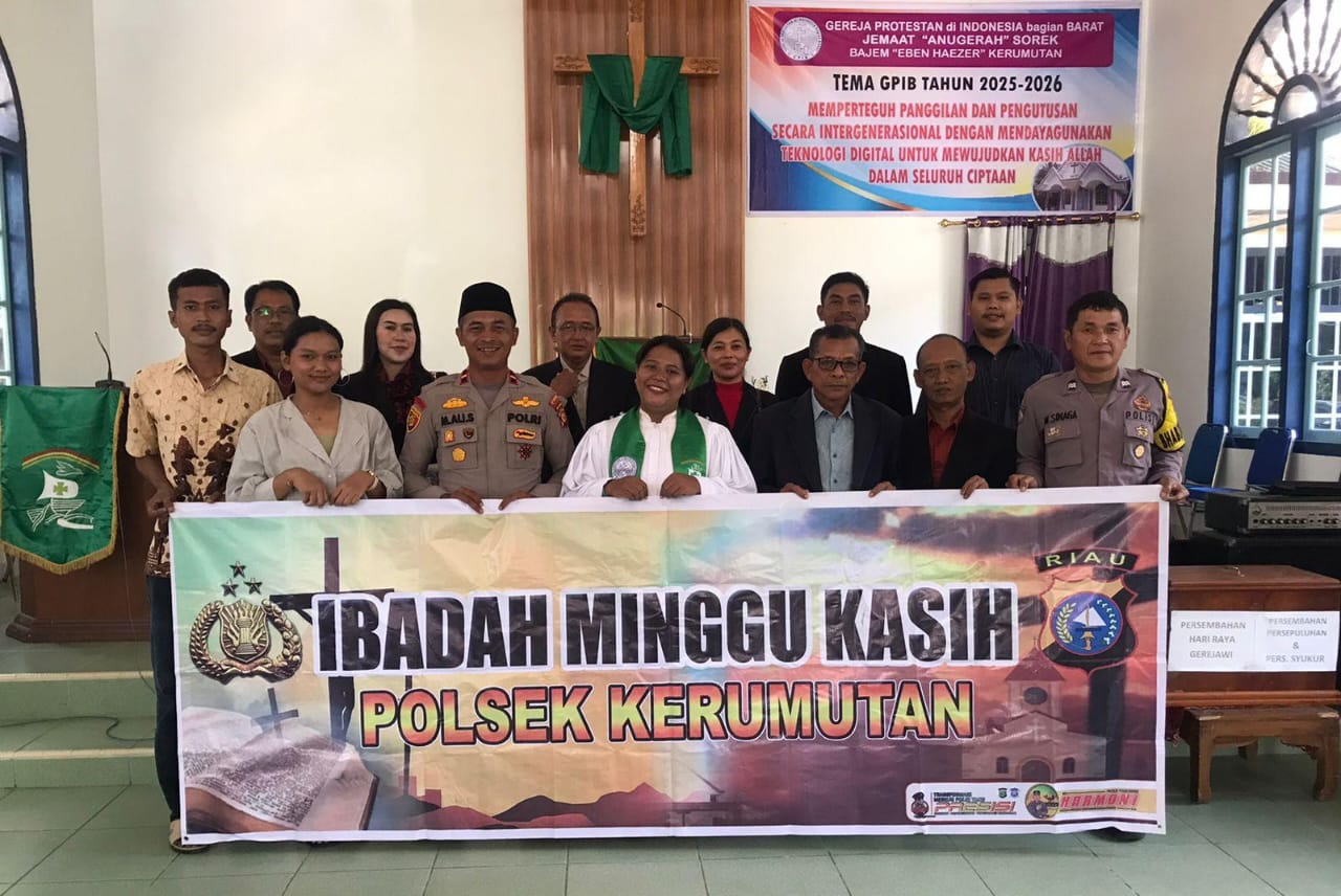 A1news.co.id | RIAU || Dalam rangka mendekatkan diri dengan masyarakat dan mendengarkan aspirasi umat beragama, Polsek Kerumutan menggelar kegiatan Minggu Kasih di Gereja Protestan Indonesia bagian Barat (GPIB) Eben Haezer, Desa Beringin Makmur, Kecamatan Kerumutan, Kabupaten Pelalawan, Minggu, 12 Oktober 2025.