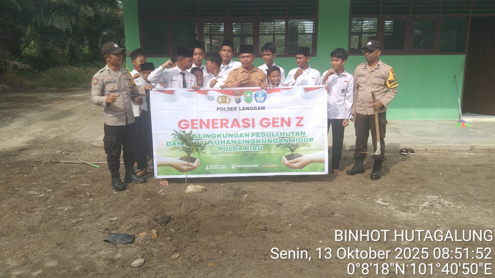 A1news.co.id | RIAU || Polsek Langgam, Polres Pelalawan, menggelar kegiatan penanaman bibit pohon di lingkungan MTs Al-Amanah, Desa Segati, pada Senin, 13 Oktober 2025, pukul 10.00 WIB.