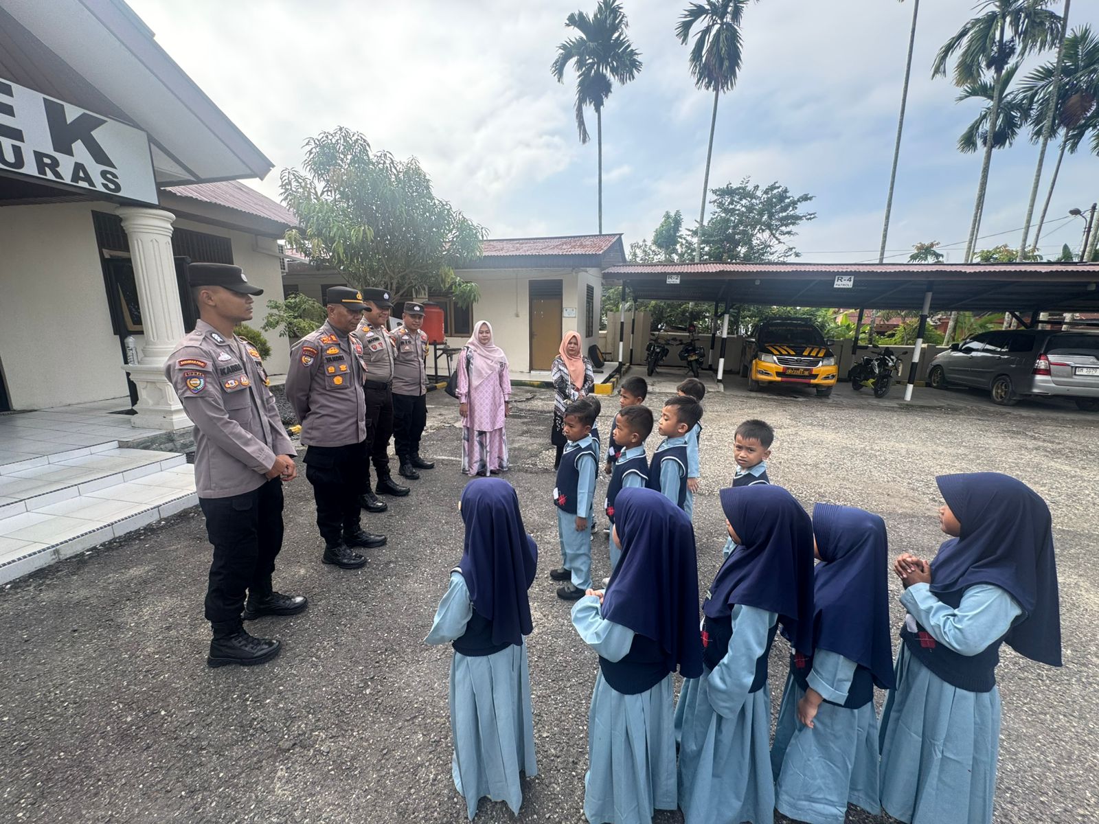 A1news.co.id | RIAU || Puluhan siswa Taman Kanak-Kanak (TK) At Taqwa dari Kampung Tengah, Kelurahan Sorek Satu, Kecamatan Pangkalan Kuras, tampak antusias saat berkunjung ke Mapolsek Pangkalan Kuras pada Kamis pagi, 16 Oktober 2025. Kegiatan ini merupakan bagian dari Program Polisi Sahabat Anak yang digagas Polri guna menanamkan kesadaran hukum dan kedekatan emosional antara anak-anak dan institusi kepolisian sejak usia dini.