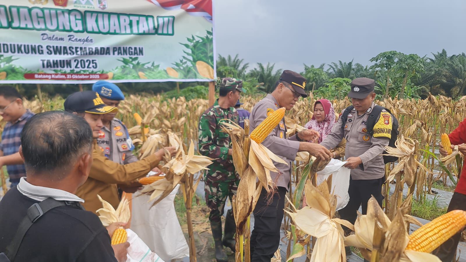 A1news.co.id | RIAU || Sebagai bagian dari upaya memperkuat ketahanan pangan, jajaran Polsek Pangkalan Kuras bersama unsur TNI dan pemerintah desa melaksanakan kegiatan panen jagung pipil di lahan milik Desa Batang Kulim, Kecamatan Pangkalan Kuras, Kabupaten Pelalawan, Selasa siang, 21 Oktober 2025.