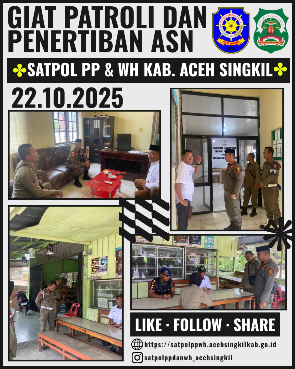 A1news.co.id|Aceh Singkil — Dalam upaya meningkatkan kedisiplinan Aparatur Sipil Negara (ASN), Satuan Polisi Pamong Praja dan Wilayatul Hisbah (Satpol PP dan WH) Kabupaten Aceh Singkil menggelar kegiatan “Patroli dan Penertiban ASN” di wilayah Kecamatan Suro, Rabu (22/10)
