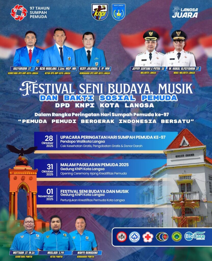 Kota Langsa – Dalam rangka peringatan Hari Sumpah Pemuda (HSP) ke 97 Tahun 2025, DPD KNPI Kota Langsa menggelar Festival Seni Budaya, Musik, Bakti Sosial pada 28 dan 31 Oktober hingga 1 November 2025.