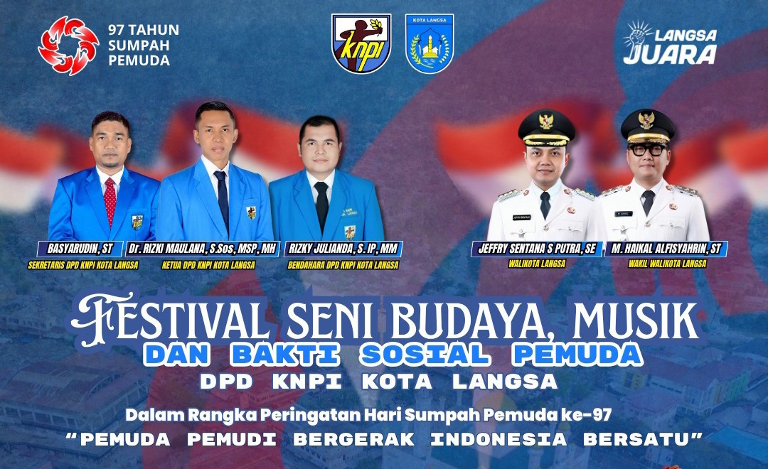 Kota Langsa – Dalam rangka peringatan Hari Sumpah Pemuda (HSP) ke 97 Tahun 2025, DPD KNPI Kota Langsa menggelar Festival Seni Budaya, Musik, Bakti Sosial pada 28 dan 31 Oktober hingga 1 November 2025.