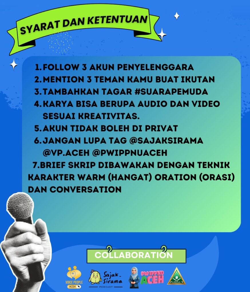 Challenge yang berlangsung dari 28 hingga 31 Oktober 2025 ini terbuka untuk seluruh generasi muda Aceh. Peserta cukup mengikuti akun penyelenggara, menandai tiga teman, dan mengunggah karya dengan tagar #SuaraPemuda serta menandai akun @sajaksirama, @vp.aceh, dan @pwippnuaceh.