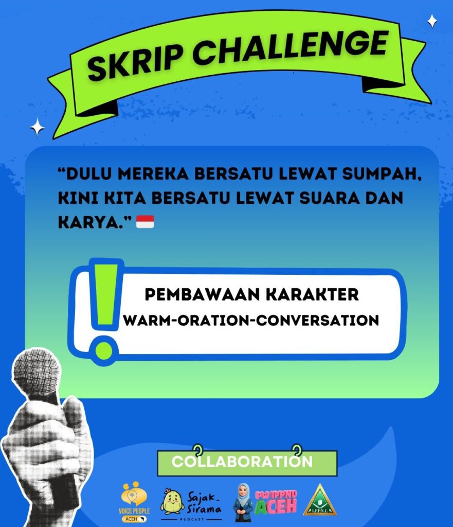 “Kami melihat banyak anak muda Aceh yang punya potensi besar di dunia suara baik itu orasi, podcast, maupun storytelling. Skrip Challenge ini bukan hanya lomba baca naskah, tapi latihan untuk mengolah emosi, intonasi, dan makna dalam setiap kata. Dari sini, kita ingin lahirkan suara-suara muda yang menginspirasi,” ungkapnya.