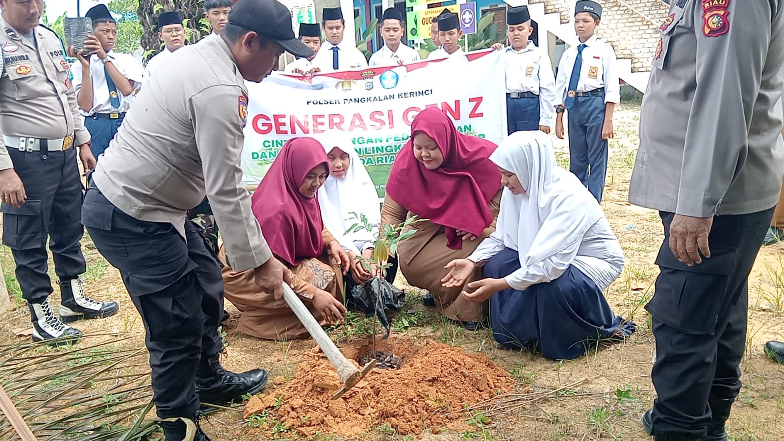 A1news.co.id | RIAU || Dalam rangka mendukung program penghijauan dan pelestarian lingkungan yang digagas Kapolda Riau, jajaran Polsek Pangkalan Kerinci menggelar kegiatan penanaman bibit pohon di SMP-IT Amanah, Desa Makmur, Kecamatan Pangkalan Kerinci, Kabupaten Pelalawan, Senin (3/11/2025).