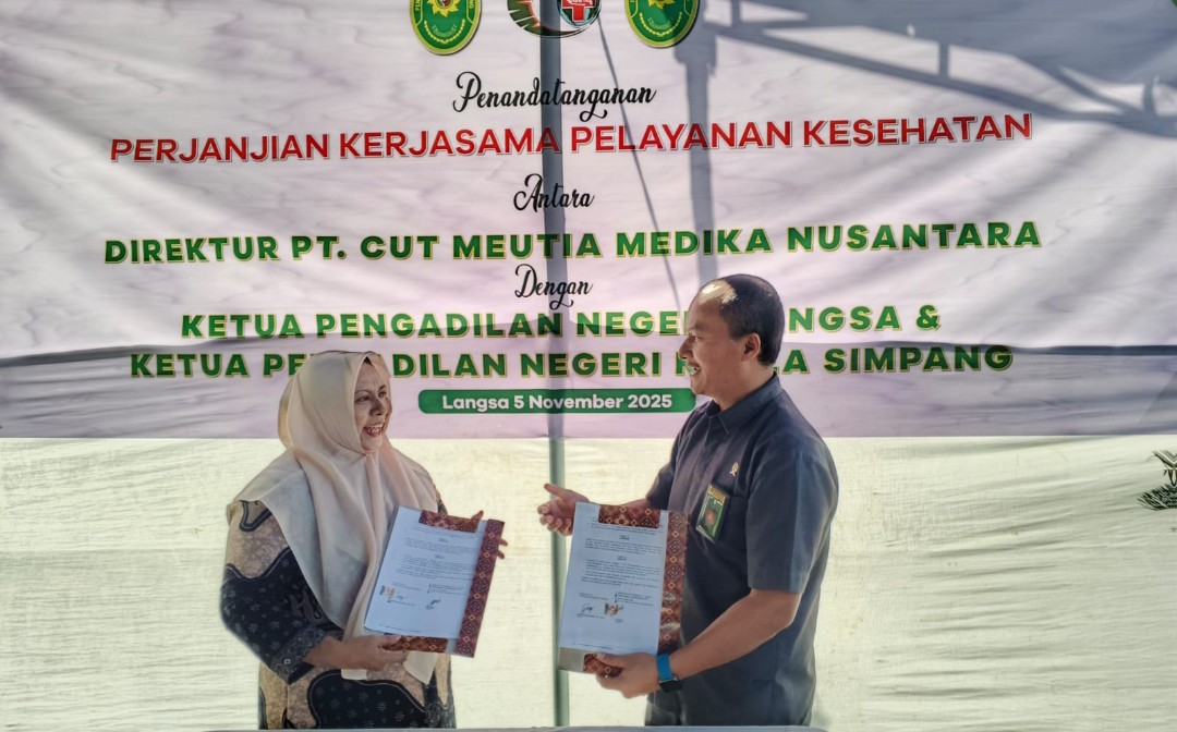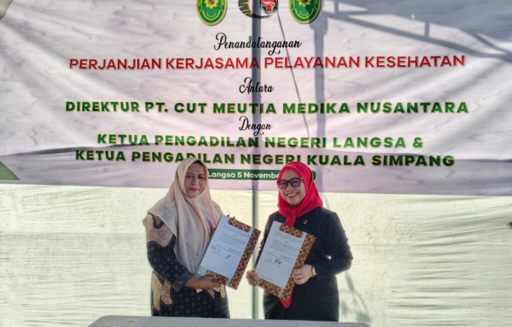 Kota Langsa – PT Cut Meutia Medika Nusantara (PT CMN) menjalin kerjasama pelayanan kesehatan dengan Pengadilan Negeri (PN) Langsa dan Pengadilan Negeri (PN) Aceh Tamiang sebagai bentuk komitmen mendukung peningkatan kualitas layanan kesehatan, di halaman Rumah Sakit Umum Cut Meutia (RSUCM), Rabu (05/11/2025).