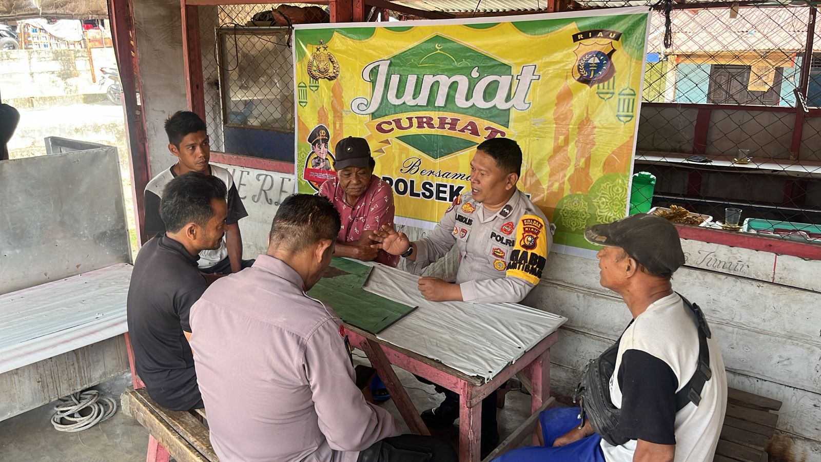 A1news.co.id | RIAU || Polsek Ukui Polres Pelalawan kembali menggelar kegiatan Jum’at Curhat bersama masyarakat Kecamatan Ukui, Jumat (7/11/2025) pagi. Kegiatan berlangsung di warung milik Pak Selamet, tepat di depan Bank BNI Ukui, dengan suasana santai namun penuh makna.