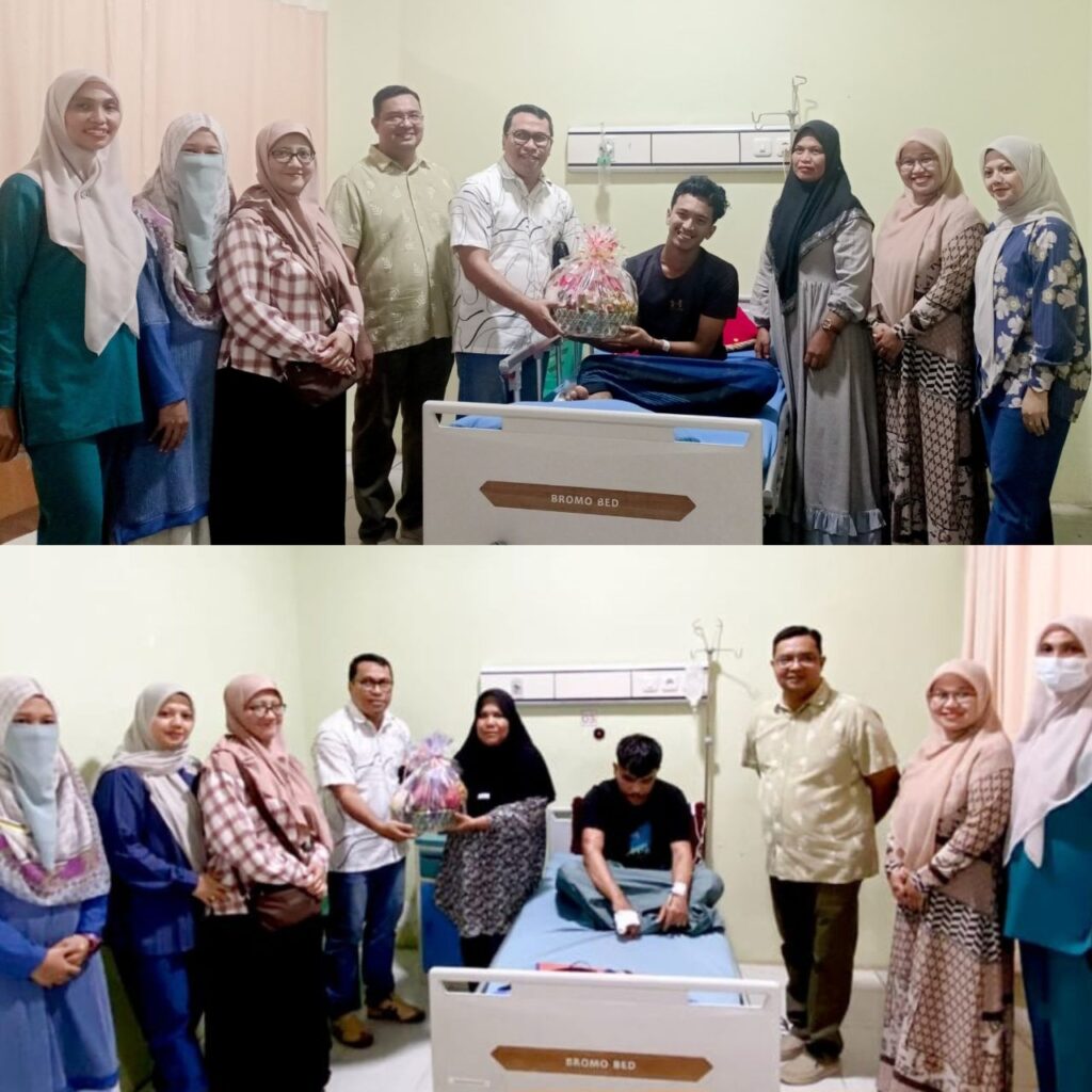 Mereka meninjau kondisi Dimas Juniandra, pekerja PKS Kebun Pulau Tiga yang mengalami kecelakaan kerja di pabrik dan kini dirawat di Ruang Keupula E3.