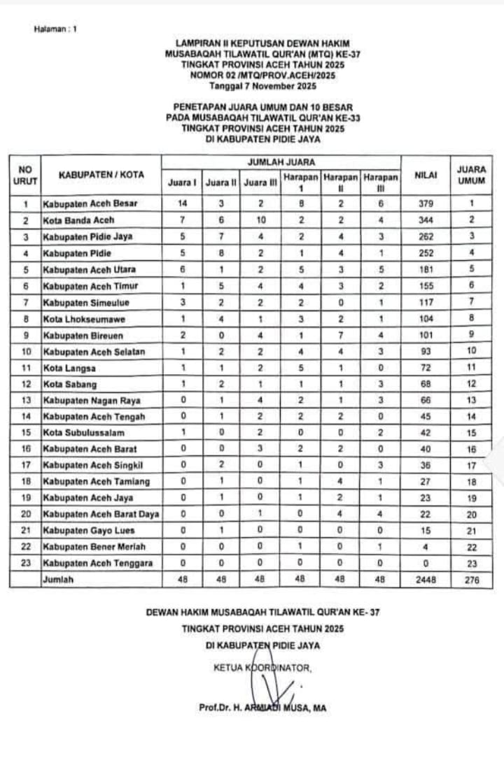 A1news.co.id|Subulussalam – Duta MTQ dari Kota Subulussalam berhasil menunjukkan penampilan maksimal di ajang MTQ tingkat Provinsi Aceh di Pidie Jaya, meskipun tidak masuk 10 besar.