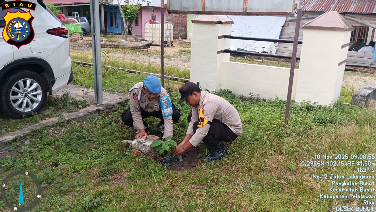 A1news.co.id | RIAU || Dalam rangka mendukung program penanaman pohon serentak 21.000 pohon yang dicanangkan oleh Polda Riau, Polsek Bunut, Polres Pelalawan, melaksanakan kegiatan penanaman bibit pohon di halaman Mapolsek Bunut, Kecamatan Bunut, Kabupaten Pelalawan, Senin (10/11/2025) sekitar pukul 09.00 WIB.