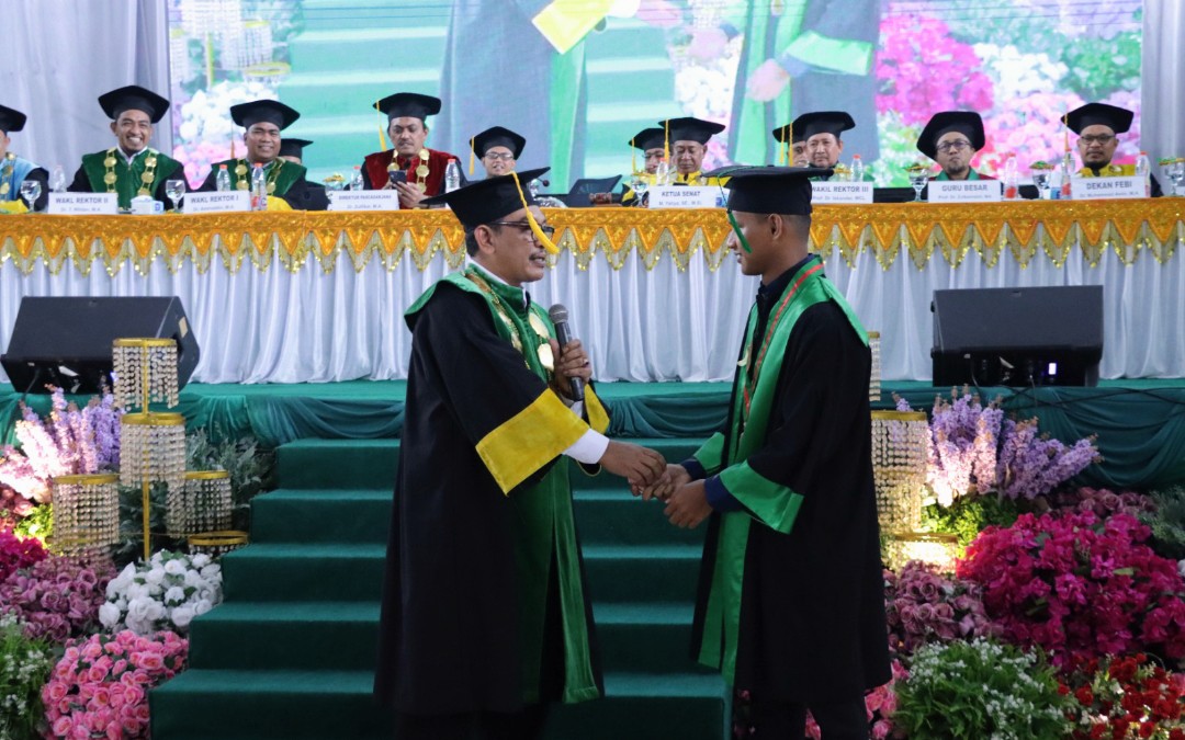 “Saya sempat mendengar perjuangan yang sangat menyesakkan nafas saya, mohon izin saya panggil ananda rizal efendi untuk maju kedepan,”imbuh rektor dengan nada terbata-bata.