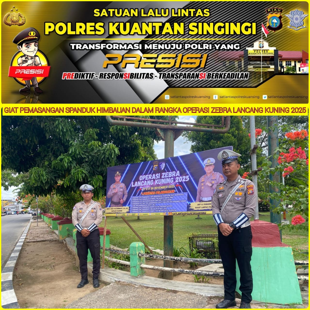 Pemasangan spanduk dilakukan oleh personel Satlantas di sejumlah titik ramai seperti ruas jalan utama Kota Teluk Kuantan. Polres Kuansing mengimbau masyarakat untuk mendukung pelaksanaan Operasi Zebra Lancang Kuning 2025 demi terwujudnya keamanan, keselamatan, ketertiban, dan kelancaran berlalu lintas. (Endang.s)