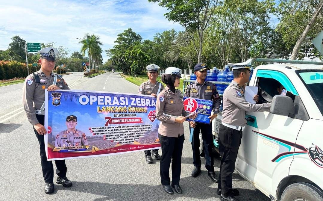 Dalam kegiatan tersebut, personel Satlantas bersama Dinas Perhubungan Kabupaten Siak memberikan himbauan keselamatan berkendara, membagikan leaflet, serta memasang stiker Ops Zebra LK 2025 kepada pengguna jalan yang melintas.