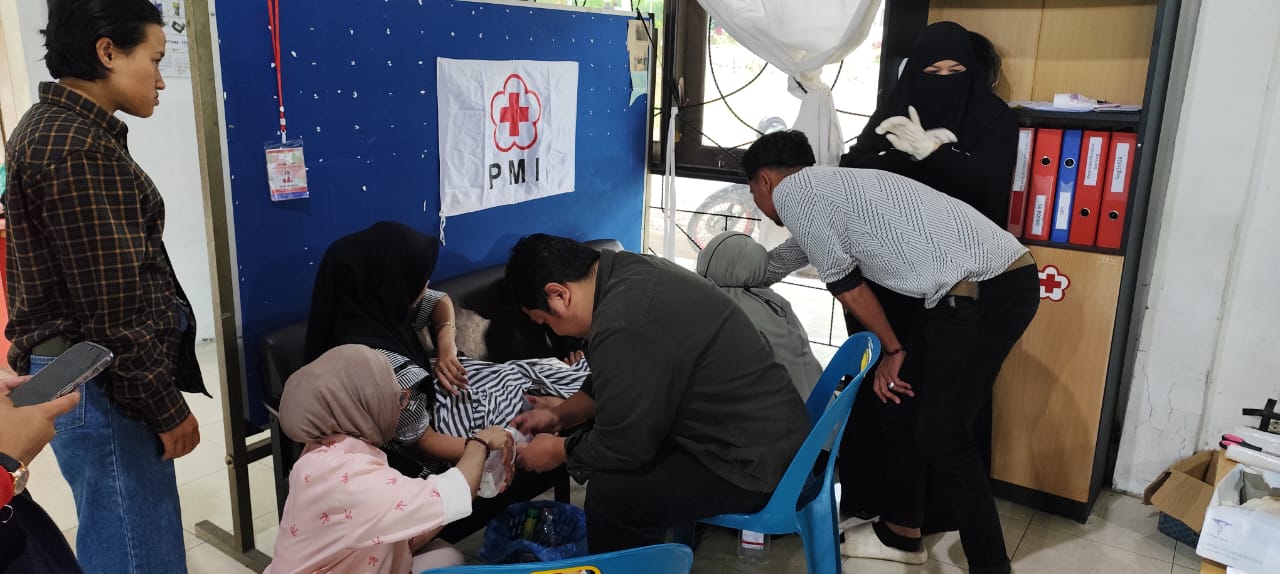 Ketua PMI di bantu oleh Momo, Lusi Devika, Nani Kasmizar dan Iko membersihkan luka luka lecet pada lengan, siku dan lutut pada korban kecelakaan.