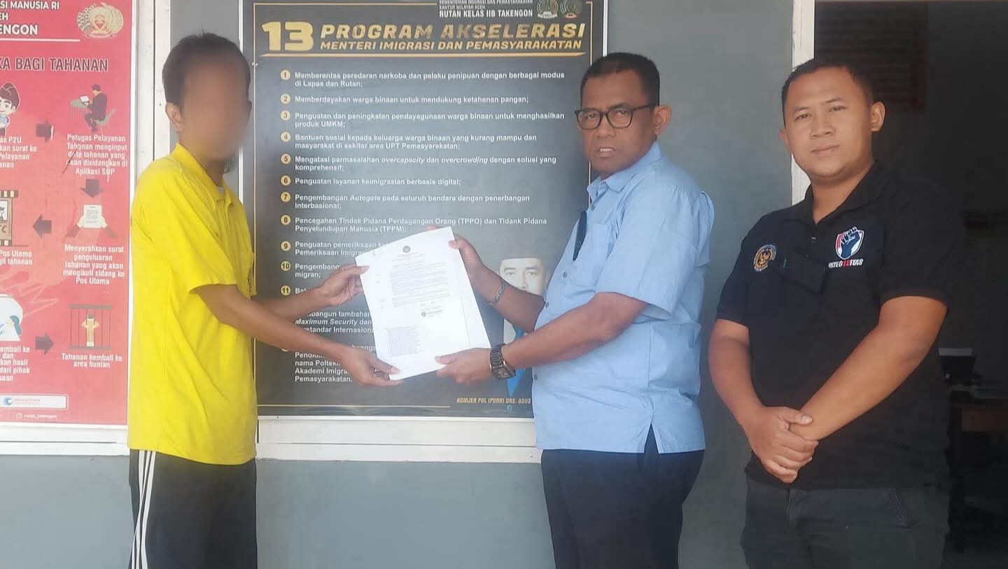 A1news.co.id|Takengon – Kepala Rutan Takengon, Rusli, didampingi Kasubsi Pelayanan Tahanan, Niko Lesmana, menyerahkan Surat Keputusan Menteri Imigrasi dan Pemasyarakatan perihal Pemberian Remisi Khusus (RK) Natal kepada 1 (satu) orang narapidana Rutan Takengon.