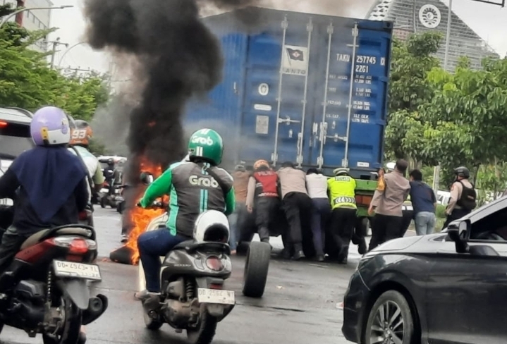 Setelah di lakukan evakuasi truk kontainer tersebut,, arus lalulintas terpantau masih padat namun tetap lancar, aksi unjuk rasa pun tetap berjalan aman dan tertib. Ucap AKP Hasanudin. S. Sos.