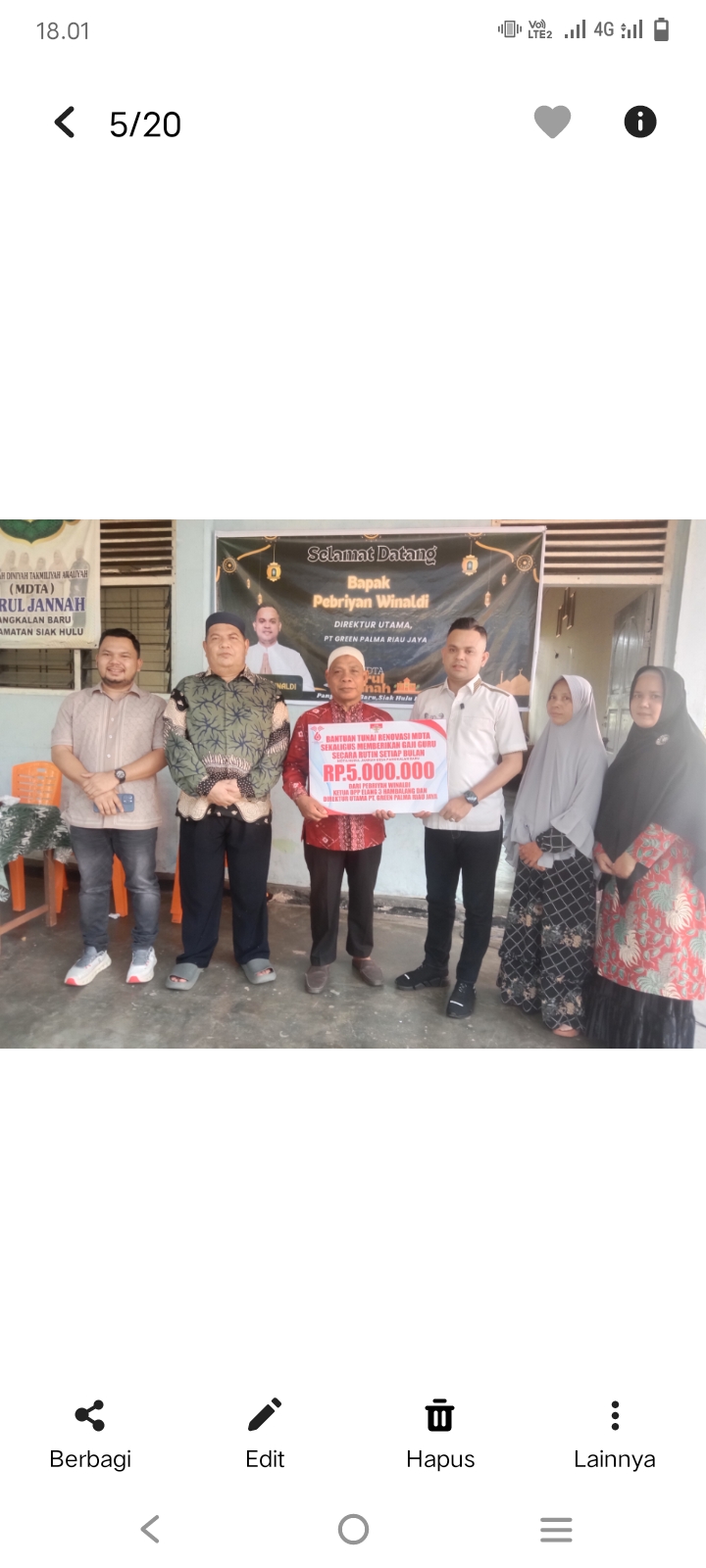 A1news.co.id | RIAU ||Program bantuan pembangunan renovasi sekolah sebesar 5 Juta Rupiah dan juga memberikan honor guru pengajar tiap bulan sebesar 1.7 juta tiap bulan dari Direktur Utama PT Gren Palma Jaya Riau dan Ketua DPP Elang 3 Hambalang Sekaligus Kader Partai Gerindra Pusat Pebriyan Winaldi berhasil menghadirkan kebahagiaan di wajah para siswa/i Madrasah Diniyah Takmiliyah Awaliyah (MDTA) Nurul Jannah, Desa Pangkalan Baru , Kecamatan Siak Hulu, Kabupaten Kampar Riau. Kamis, (22/01/26)
