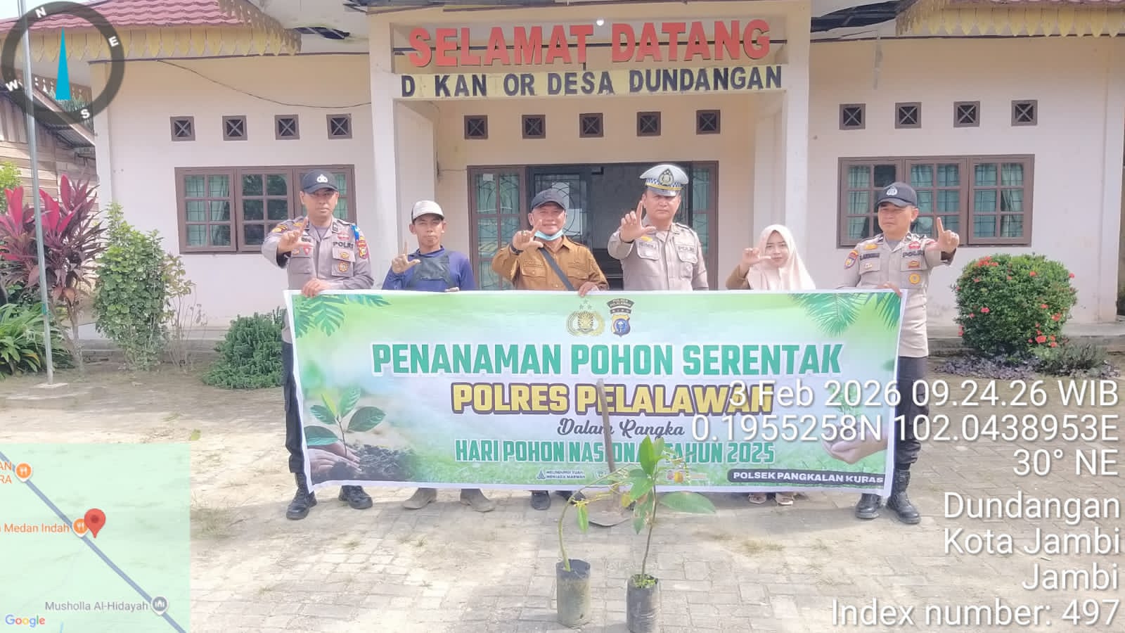 A1news.co.id |RIAU ||Polres Pelalawan melalui Polsek Pangkalan Kuras melaksanakan kegiatan penanaman bibit pohon buah sebagai bentuk dukungan terhadap Program Kapolda Riau Green Policing. Kegiatan tersebut digelar di Kantor Desa Dundangan, Jalan Lintas Timur Km 104, Kecamatan Pangkalan Kuras, Kabupaten Pelalawan, Selasa (3/2/2026) pagi.