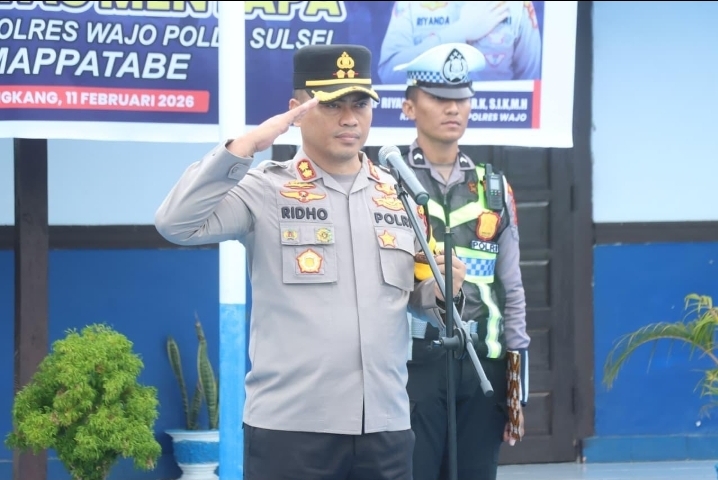 Wajo, Sul-sel a1news.co.id Kapolres wajo, Akbp. Muh. Rosid Ridho, S.I.K, pimpin apel dan sosialisasi polantas “MAPPATABE” bersama pengemudi Ojek Online (Ojol) kabupaten wajo, yang di laksanakan secara serentak di wilayah hukum polda Sul-sel pada Rabu pagi 11/02/2026. di lapangan upacara satlantas polres wajo,